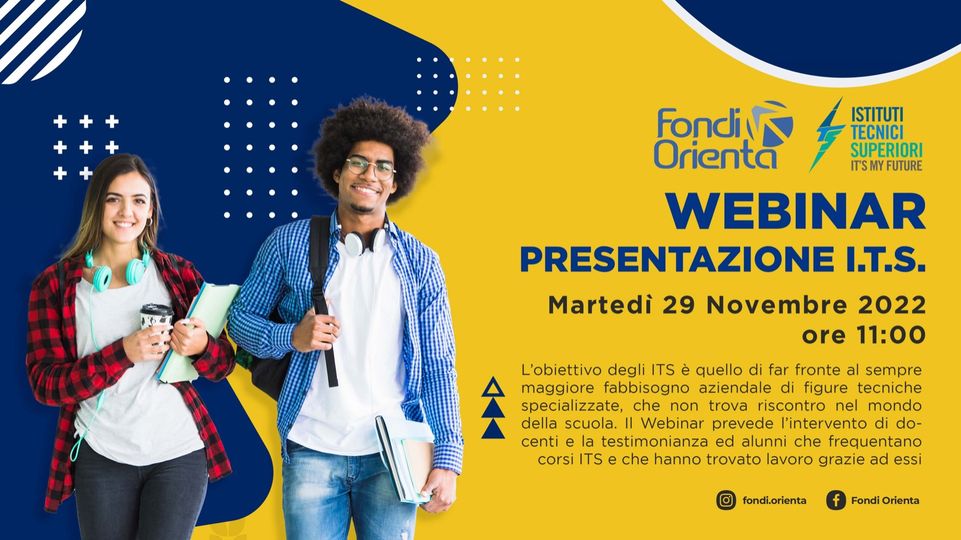 Il 29/11 alle ore 11 presenteremo gli I.T.S Istituti Tecnici Superiori, come offerta formativa professionalizzante terziaria. L’obiettivo degli ITS è quello di far fronte al sempre maggiore fabbisogno aziendale di figure tecniche specializzate, che non trova riscontro nel mondo della scuola.